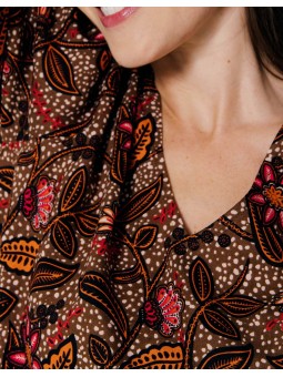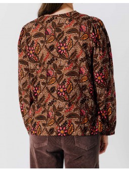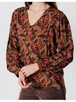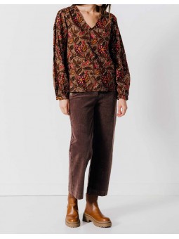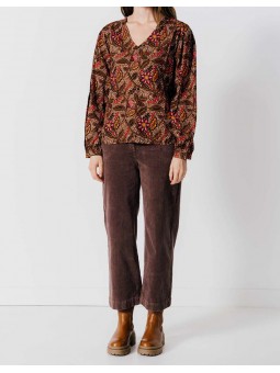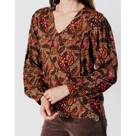 Féminine, lumineuse et pleine de caractère, cette blouse séduit par son imprimé floral aux nuances automnales de brun, orange et fuchsia. Sa coupe fluide et son col en V mettent en valeur la silhouette tout en garantissant un confort absolu au quotidien. Les manches légèrement bouffantes apportent une touche romantique tandis que le tissu léger lui confère une allure aérienne et raffinée. Associez-la à un pantalon en velours, un jean ou une jupe midi pour un look chic et facile à porter. Une pièce indispensable pour colorer vos journées d’automne tout en élégance.