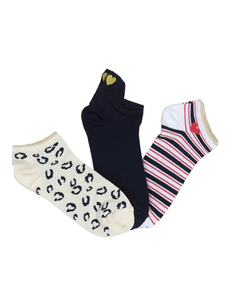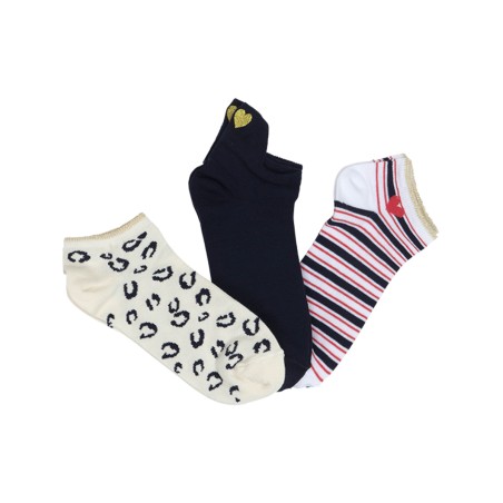 Ce lot de 3 socquettes joue sur les contrastes élégants entre motifs intemporels et détails raffinés. Vous y trouverez une paire à motif léopard beige et marine, une paire unie bleu marine avec un petit cœur doré, et une paire rayée esprit marin rouge, blanc et bleu. Leur coupe basse se glisse discrètement dans vos baskets pour un confort au top, tout en apportant une touche mode à votre look.