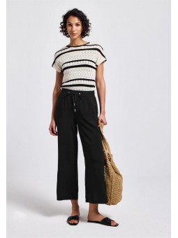 Ce pantalon fluide à jambe large est un incontournable pour un dressing à la fois chic et confortable. Sa taille élastiquée avec cordon de serrage offre un ajustement parfait et une grande liberté de mouvement. Confectionné dans un tissu léger et agréable au toucher, il garantit un tomber élégant et un confort optimal tout au long de la journée. Sa coupe cropped à la cheville modernise la silhouette et permet de le porter aussi bien avec des sandales que des baskets. Disponible en deux teintes faciles à assortir — noir intemporel et beige naturel —, ce pantalon s’adapte à tous les styles, des looks décontractés aux tenues plus habillées.