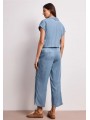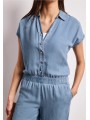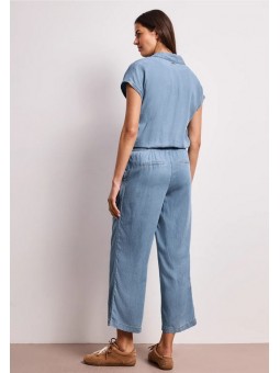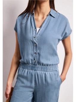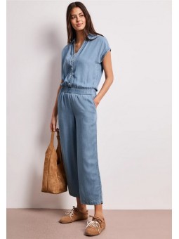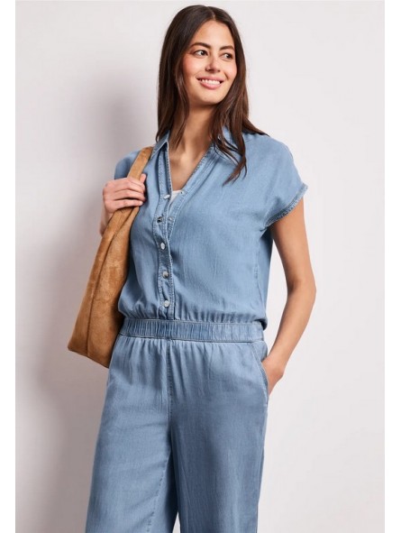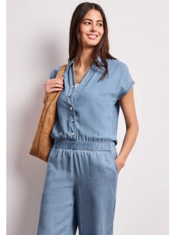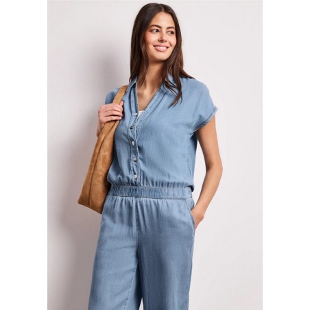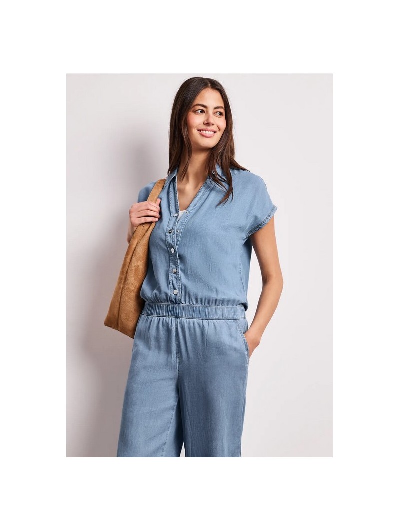 Cette combinaison Street One en denim léger séduit par sa coupe fluide et son style naturellement élégant. Son haut façon chemise avec boutons et son décolleté subtil apportent une touche féminine, tandis que la taille élastiquée souligne la silhouette avec confort. Son pantalon large renforce l’allure moderne et décontractée. Facile à porter au quotidien, elle s’associe aussi bien avec des baskets qu’avec des sandales pour un look estival, simple et toujours tendance.
