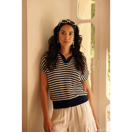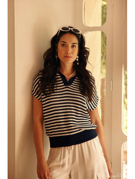Pull marinière LOLA revisité au style chic et intemporel. Sa maille légère offre un confort agréable tout en apportant une belle tenue à la silhouette. Les rayures contrastées donnent du caractère au modèle tandis que l’encolure en V structurée apporte une touche moderne et féminine.