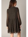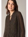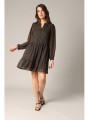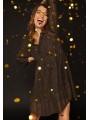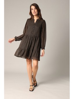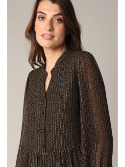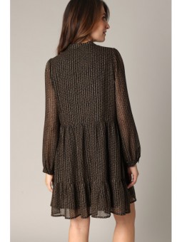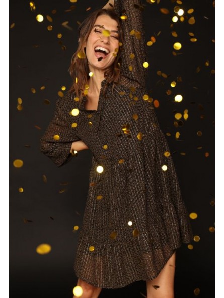 Cette robe courte séduit par son tissu fluide parsemé de fils dorés, subtilement scintillants à la lumière. Sa coupe légèrement évasée offre un tombé aérien et une allure pleine de mouvement, tandis que son col en V et ses manches longues apportent une élégance naturelle. Idéale pour les fêtes ou les soirées d’hiver, elle se porte aussi facilement au quotidien avec des bottines pour un look chic et décontracté. Une robe qui invite à célébrer chaque instant avec style et légèreté
