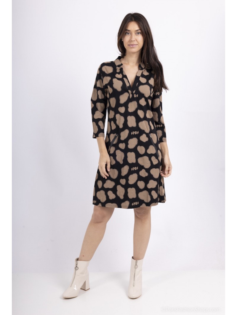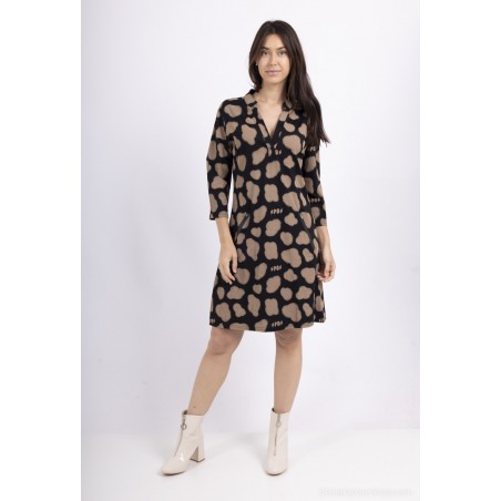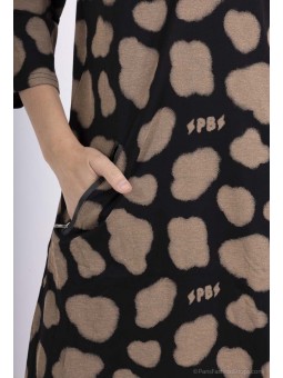 Adoptez une allure moderne et féminine avec cette robe noire à imprimé beige effet taches, parfaite pour dynamiser vos tenues d’automne-hiver. Sa coupe droite et légèrement évasée offre une silhouette flatteuse et confortable, tandis que son col V apporte une touche élégante et subtilement décolletée. Les manches 3/4 et les poches zippées donnent à cette pièce un esprit pratique et contemporain, idéal pour une journée active ou une sortie plus habillée. À porter avec des bottines pour un look tendance, ou avec des baskets pour une version plus casual.