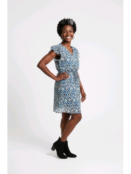 Cette robe courte séduit par son imprimé graphique aux tons bleu et écru qui apporte du caractère tout en restant chic. Sa coupe fluide et sa taille légèrement marquée mettent la silhouette en valeur sans compromettre le confort. Les manches courtes volantées ajoutent une touche de légèreté et de féminité. Facile à associer avec des bottines, des sandales ou des baskets, elle vous accompagne aussi bien au travail que lors de vos sorties.
