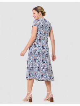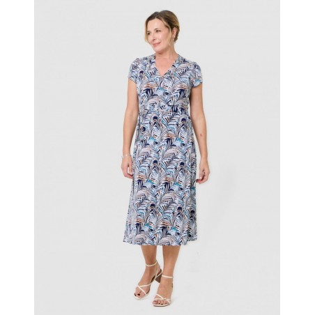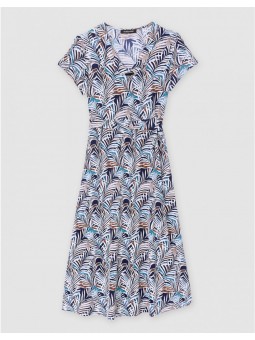 Son motif aux nuances de bleu, écru et touches naturelles crée un rendu harmonieux et moderne. Sa coupe légèrement évasée marque délicatement la taille, offrant une silhouette élancée et flatteuse.