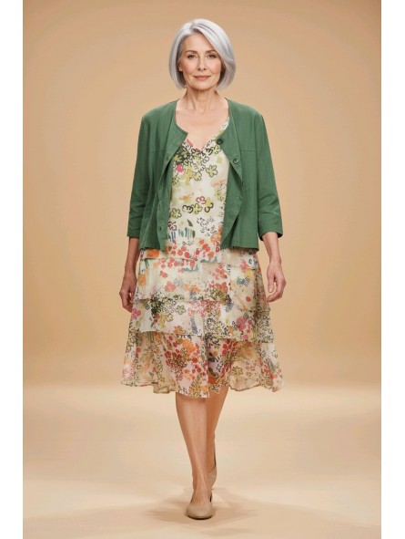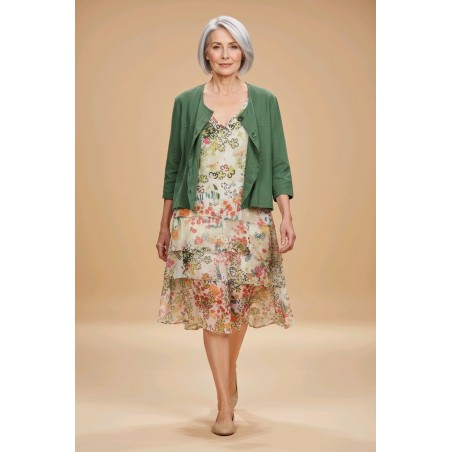Cet ensemble associe une robe fluide aux imprimés floraux délicats et une veste légère dans un vert naturel plein de fraîcheur. La robe séduit par son tombé aérien et ses motifs colorés qui apportent une touche de poésie au look, tandis que la veste structure la silhouette avec simplicité et raffinement. Confortable et facile à porter, cet ensemble est idéal pour les beaux jours, entre élégance décontractée et charme intemporel.