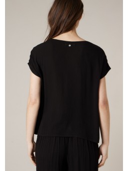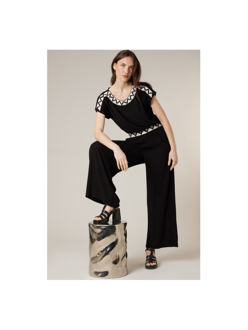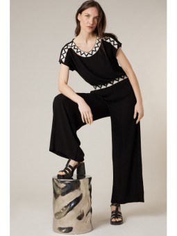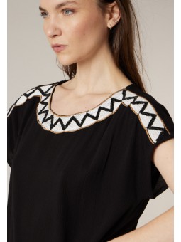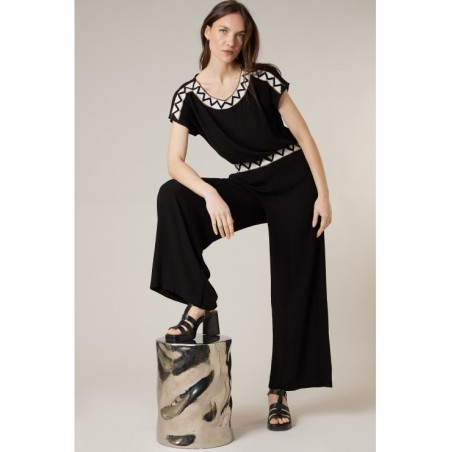 Ce haut noir séduit par sa coupe fluide et son tombé impeccable qui sublime la silhouette en toute simplicité. Son encolure arrondie est délicatement mise en valeur par un motif graphique contrasté qui apporte une touche moderne et raffinée. Les manches courtes légèrement amples offrent confort et liberté de mouvement, pour un porté agréable au quotidien. Facile à associer, il se porte aussi bien avec un pantalon habillé pour une allure sophistiquée qu’avec un jean pour un look plus décontracté chic. Une pièce intemporelle, élégante et facile à vivre, idéale pour compléter votre dressing avec style.