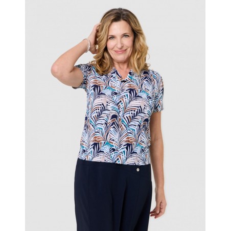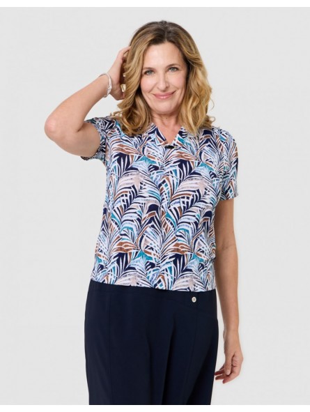 Son imprimé aux nuances de bleu, écru et touches naturelles crée un jeu de contrastes harmonieux et élégant. Sa coupe fluide épouse délicatement la silhouette sans la marquer, offrant un confort optimal tout au long de la journée.