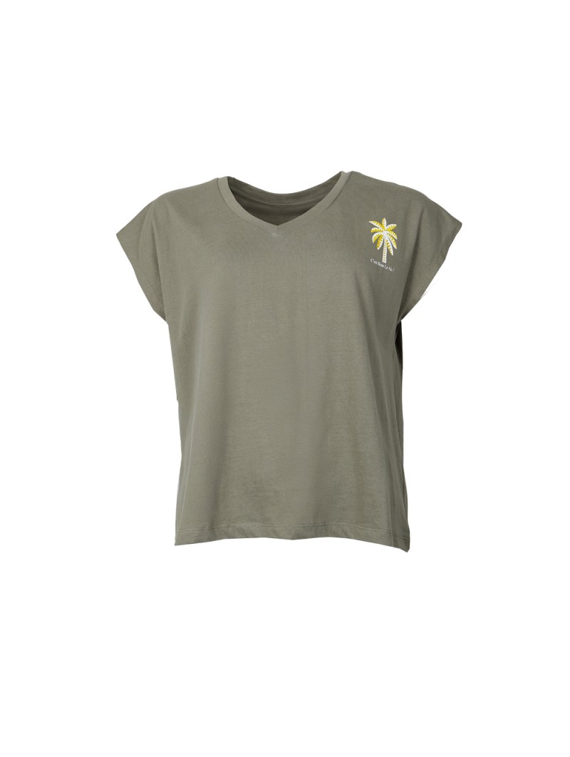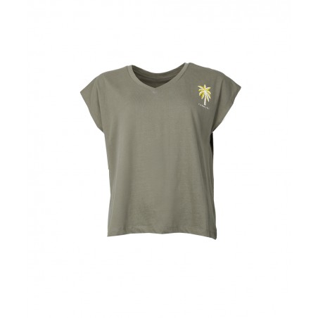 Ce t-shirt à la coupe décontractée séduit par son style simple et efficace, sublimé par un motif palmier discret qui apporte une note estivale. Son col V met délicatement en valeur le décolleté, tandis que ses manches légèrement tombantes renforcent son allure casual et moderne. Confortable et facile à porter, il s’associe aussi bien avec un jean, un short ou un pantalon blanc pour un look frais et lumineux. Disponible en kaki et en blanc, il devient rapidement un indispensable du dressing pour les beaux jours.